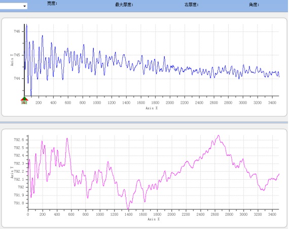 对晶圆进行对射扫描,读取上下镜头以及厚度度数,测量硅片翘曲。 1、采用D40A36R2S10镜头对样品间隔100um进行5次扫描,操作简单快速。 2、扫描过程中,采集样品的上下镜头高度数值测量值,并计算厚度数值(镜头沿Y轴方向扫描,然后平移100um,再进行相同长度的扫描,步距2um)。 3、可以通过三组数值来确定晶圆翘曲。 4、针对半透明晶圆,可以采用双波段控制器进行对射扫描。