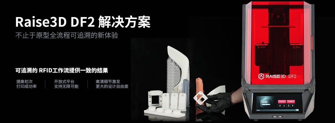 RFID工作流,让光固化3D打印更高效 DF2 可追溯工作流的核心是 RFID 技术,该技术与 ideaMaker®一起使用,可确认每批打印件都使用了正确的设置。一旦确认了树脂类型,DF2 打印机、DF Wash 和 DF Cure 设置将通过内置的设置参数文件自动完成。这不仅减少了人为错误的机会,节省了操作时间和成本,还确保了每一批打印件在光固化3D打印机环境下均可实现稳定、可重复的高精度打印结果。 高清细节激发更大的设计自由度 作为一款DLP光固化3D打印机,DF2 的分辨率为 2560 x 1440 ,结合轮廓补偿和抗锯齿等先进功能,和其他3D打印技术相比,可生成高精度的细节和更光滑的表面,这为具有高精度的小型零件提供了更多的机会。此外,光学设计和系统校准确保了每个步骤的平滑性和准确性。 ·采用德州仪器工业级 DMD 芯片的 DLP打印光引擎 ·优质的光输出质量,画面尺寸误差不高于±0.1 毫米,设计畸变率不高于 0.1% ·像素图像清晰,无叠加效应或表面光场效应。 提高初次打印成功率 DF2 光固化3D打印解决方案通过机械设计和软件支持实现高打印成功率: · 在 ideaMaker®中进行的优化(包括自动支持、自动朝向和吸盘检测),提高了 DF2 的初次打印成功率,并减少了耗时的重复打印。 · 悬浮气膜剥离技术降低了施加在零件上的力,便于层间分离,进一步提高了打印结果的可靠性。 · 重型 Z 轴结构可承受高达 200 公斤的静态负载,确保任何尺寸的打印在 Z 轴方向都能达到高质量,至高可负载 10 kg 模型。 开放式平台支持更多可能 Raise3D 在材料科学方面不断创新,开发了多种专用于 DF2 光固化3D打印机的高性能 DLP 树脂,并针对 Raise3D DF2 解决方案进行了优化。Raise3D 还与汉高(Henkel)和 Forward AM 等战略合作伙伴合作,共同验证联合品牌树脂。 借助 Raise3D OMP(开放材料计划),用户可自由探索光固化3D打印的新可能,扩展更多工业级应用场景。 DF2 主要规格 RFID 驱动的智能构建平台 RFID 可自动存储和读取、清洗和固化整个工作流程的相关参数 从而减少繁琐的手工操作,让光固化3D打印机工作流程更高效一致。 工业级光学设计 工业级光学元件,包括德州仪器工业级 DMD 芯片、高透 nFEP 薄膜和德国肖特光学玻璃。它们用于整个光路投影系统,以减少损耗、消除色散从而确保光固化3D打印机呈现出精细而清晰的成像效果。 简化软件 ideaMaker 增加了与 DF2 光固化3D打印机配合使用的新功能,以减少学习曲线、扩大设计可能性并提高 DLP 打印的成功率。这些功能包括: *抗锯齿功能 *自动生成支撑 *自动朝向 *轮廓补偿 *抽壳 *纹理生成 *自动截面分析 *倒杯囗检测 *打孔 *更小的 Gcode尺寸 指尖上的神奇布局 10.25 英寸的高性能触摸屏让您在光固化3D打印机上即可即时更改文件,而无需返回到切片软件; Magic Layout 可以轻松调整打印布局和重复打印; 自动打印前检查可验证所有工作条件,包括树脂类型、构建平台安装、进料站安装、树脂余量等,确保光固化3D打印机的每一次输出都可靠。 悬浮气膜剥离技术减轻负载 在树脂槽底部和高透明度玻璃之间使用悬浮气膜剥离技术,将剥离力从50千克减少到10千克,有效帮助剥离每一层,确保成功的打印效果。 高负载能力Z 轴 Z 轴的承载能力可达 200 千克,具有高移动精度和无交错层的特点。 这确保了打印大型部件和长时间使用时的稳定性。 精简的树脂管理 自动树脂补给、超声波液位检测和辅助树脂槽清理,大幅减少与光固化树脂的接触。 DF Wash 系统通过自动排水和易于操作的自动泵简化了溶剂去除过程。